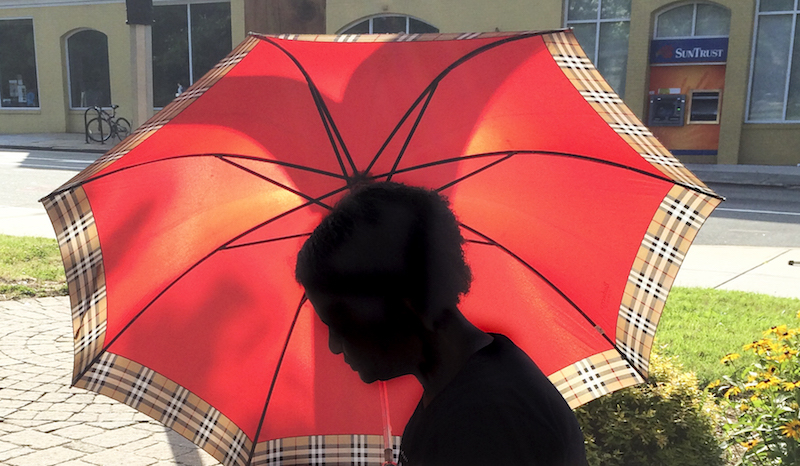 A woman was reading in Black Wall Street Plaza in Durham, an umbrella propped up to shield her from the sun. Later I noticed the SunTrust ATM in the background, with the same color scheme as the umbrella.