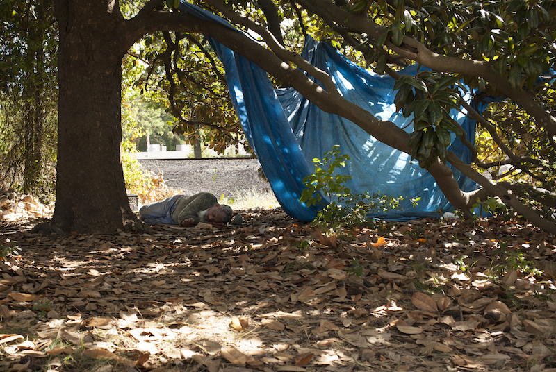 Man sleeping by the railroad tracks near Ninth Street