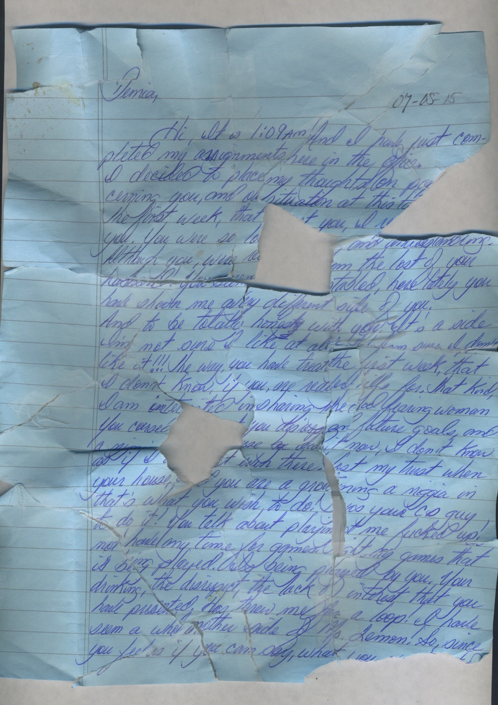 On a July morning last summer, I came upon these scraps of blue paper woven in the grass. I gathered all that I could find, and returned the next day to sift through the grass some more. While piecing them together, it became clear there were two sheets of paper, and that I was assembling two jigsaw puzzles at the same time.